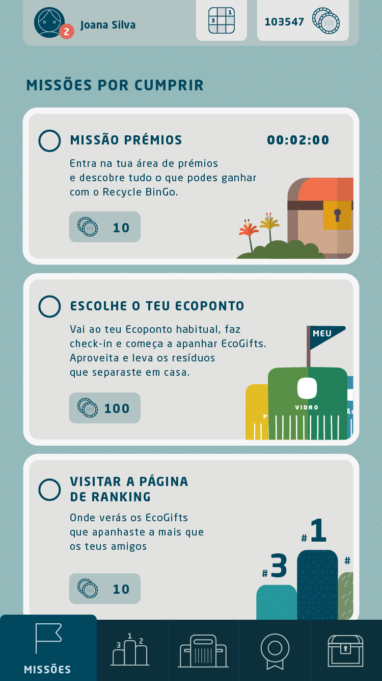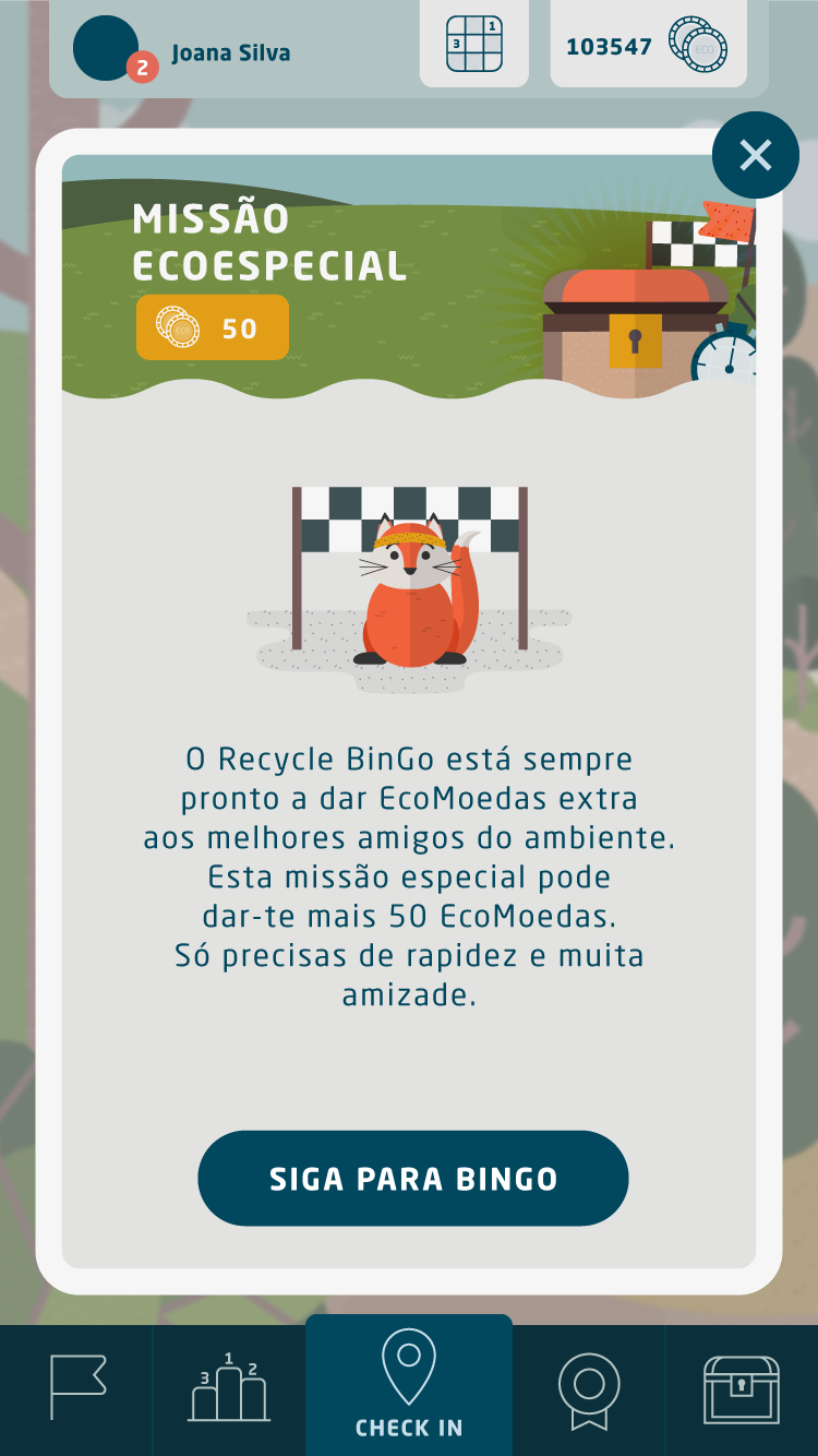 Além desta missão principal o Recycle BinGo vai lançar-te missões especiais. Desafios divertidos que vão pôr à prova o teu bichinho da reciclagem. E, claro, recompensar-te com mais EcoMoedas que podes trocar por ótimos prémios.